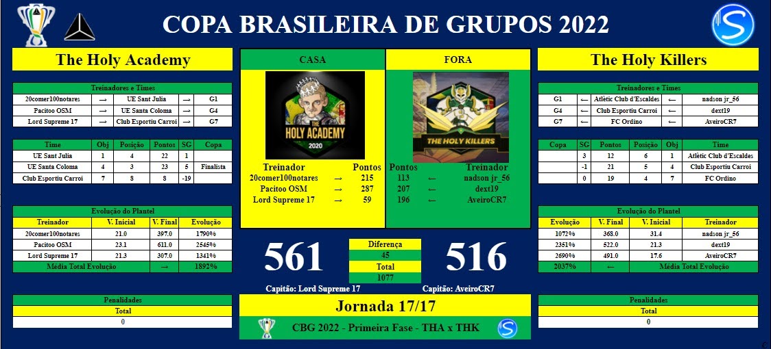 OBS: Os Grupos ficam responsáveis por indicar um Capitão, que será o responsável por postar os Resultados ao Final das Rodadas e Possíveis Penalidades. Caso seja necessário, os Grupos devem indicar o PM (Moderador da Liga).