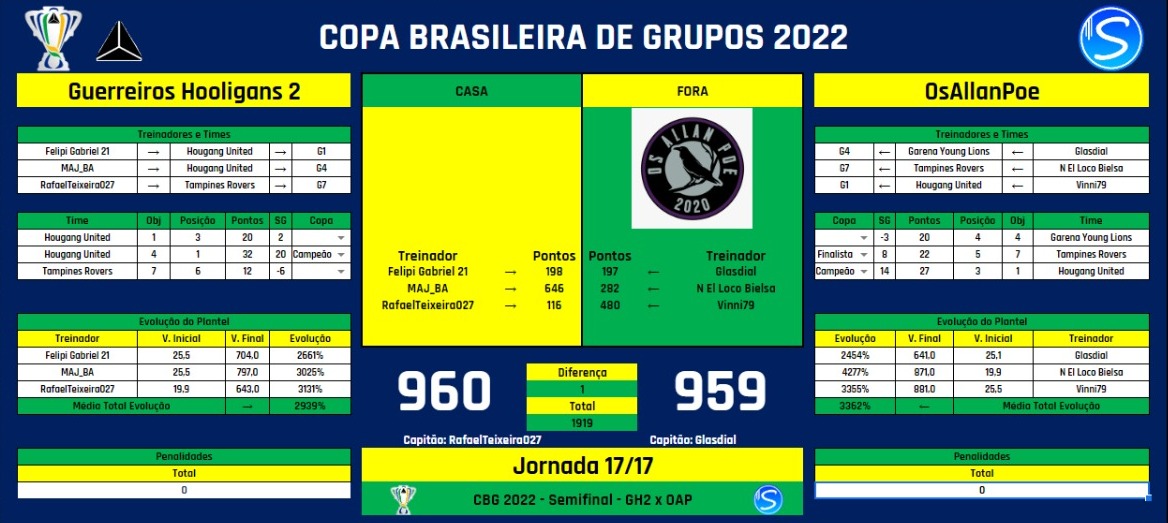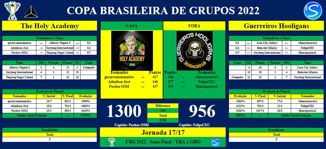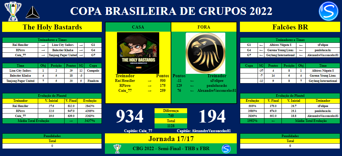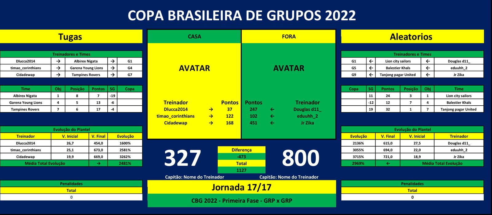 OBS: Os Grupos ficam responsáveis por indicar um Capitão, que será o responsável por postar os Resultados ao Final das Rodadas e Possíveis Penalidades. Caso seja necessário, os Grupos devem indicar o PM (Moderador da Liga).