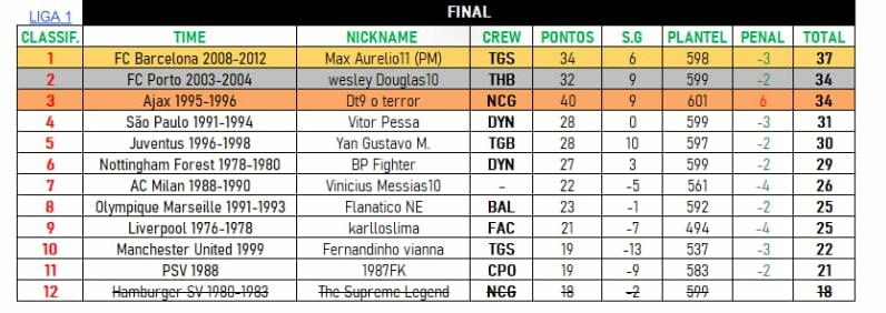 Na próxima imagem está a classificação final do campeonato, que por sinal foi uma das maiores campanhas que um treinador já fez na história competição. Em breve será divulgada a classificação final com a distribuição de pontos por parte da organização.