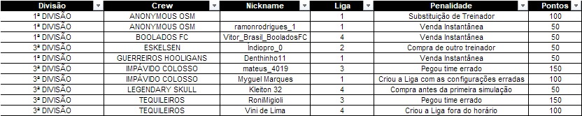 A Liga deve ser criada de acordo com o que for estipulado. Caso o Moderador da Liga crie ela de forma errada, o grupo do treinador sofrerá uma punição de -100 pontos e deverá ser criado uma nova liga de forma correta.10.2 Escolha de equipe errada: