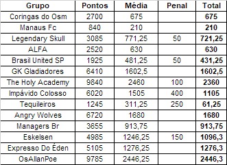 Dividido nas 4 ligas o grupo teremos G1, G5, G9 e G13. E a pontuação de cada grupo será calculada de acordo com a Planilha de Cálculo da Competição.- O Formato das Divisões será realizado de acordo com a quantidade de grupos inscritos.