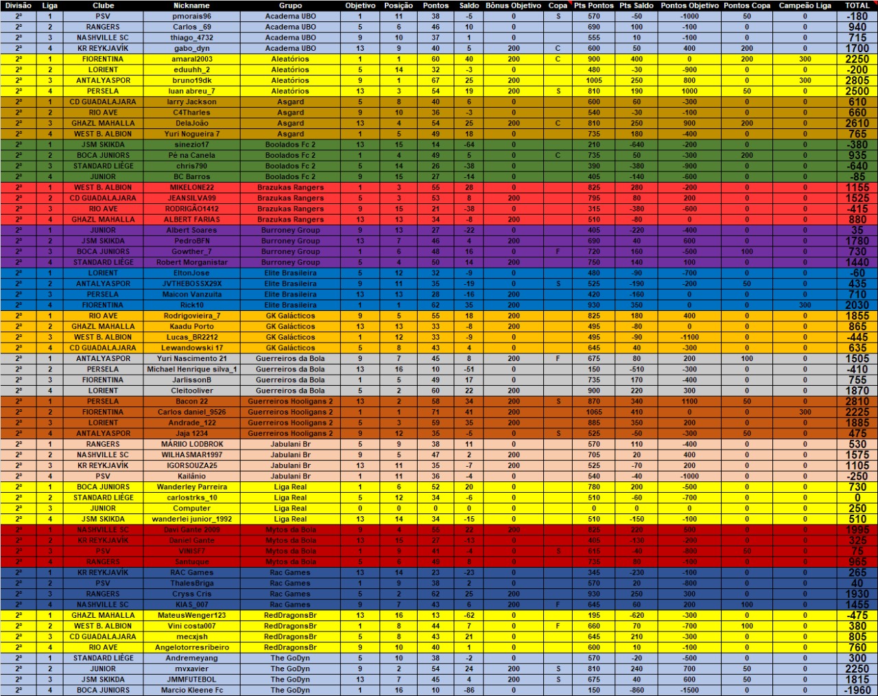 Liga A Trouyes 2487; Liga B Basel 1177; Liga C CF Monterrey 507; Liga D Benfica 627 Total: 4.798+1000 = 5798 PONTOS