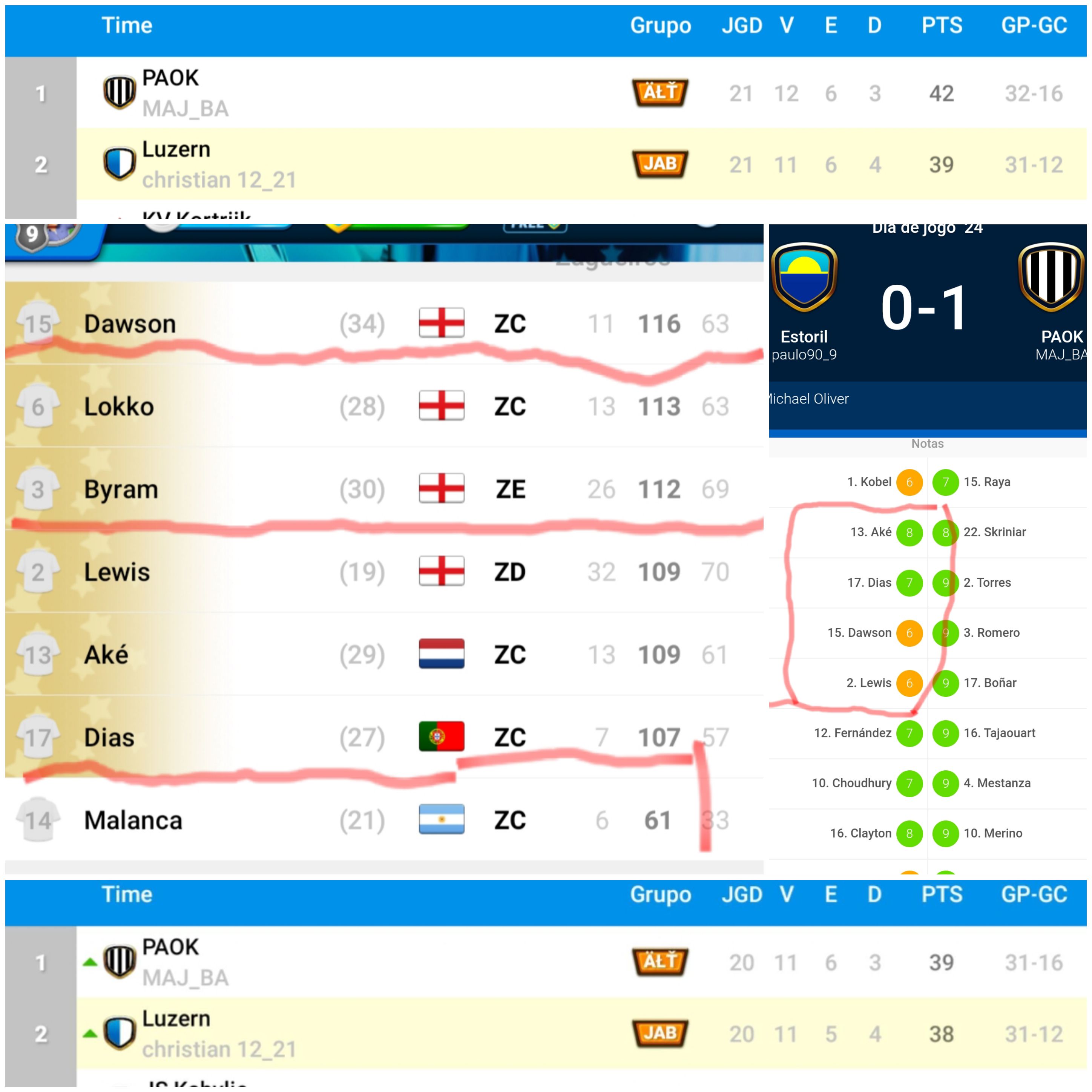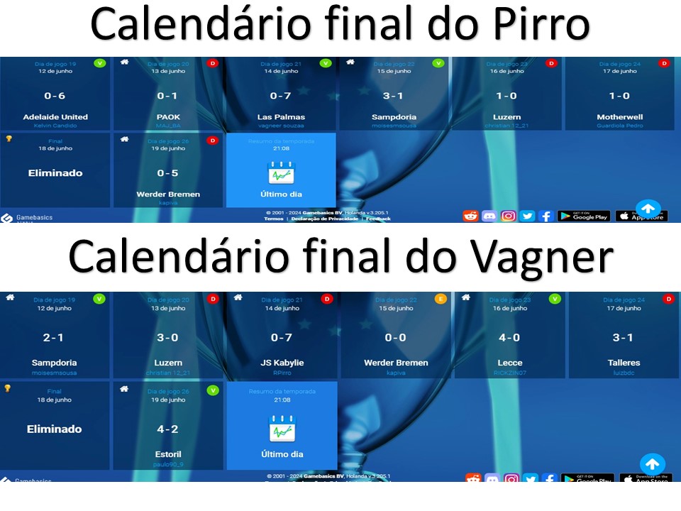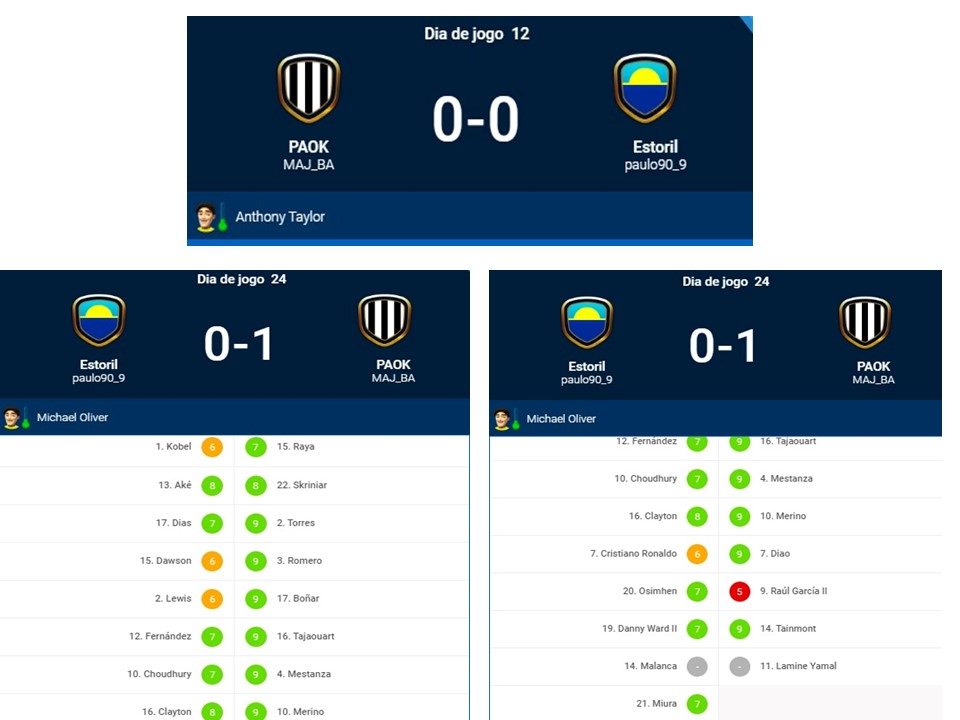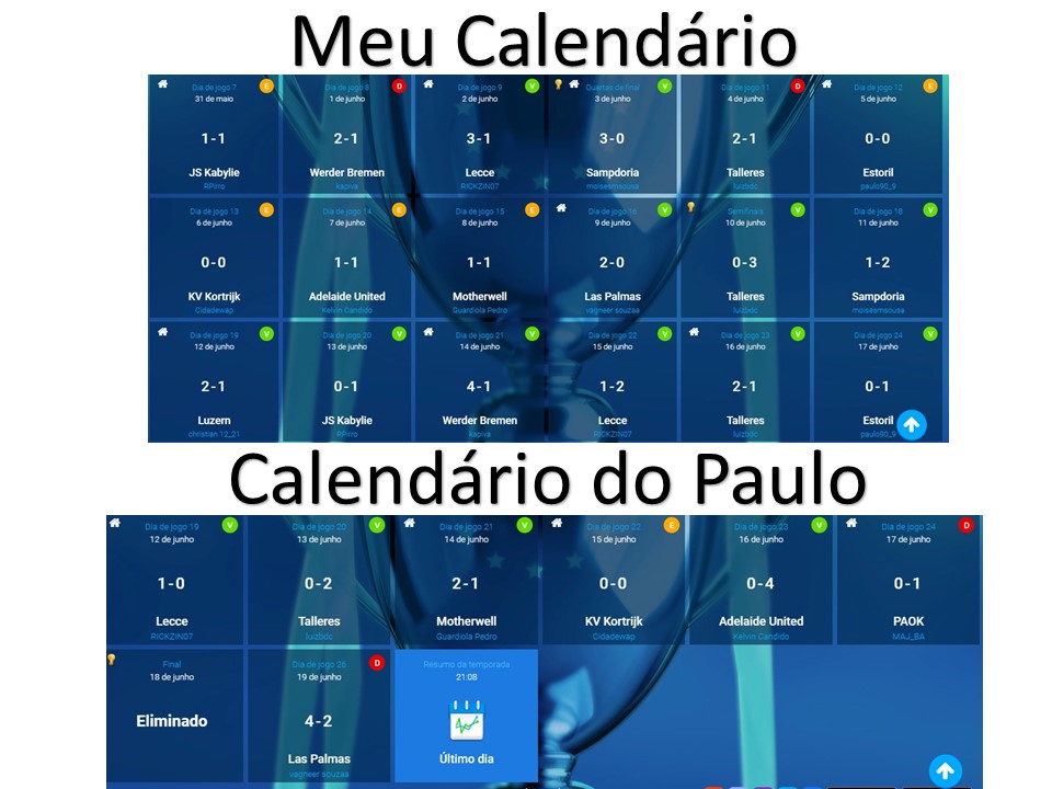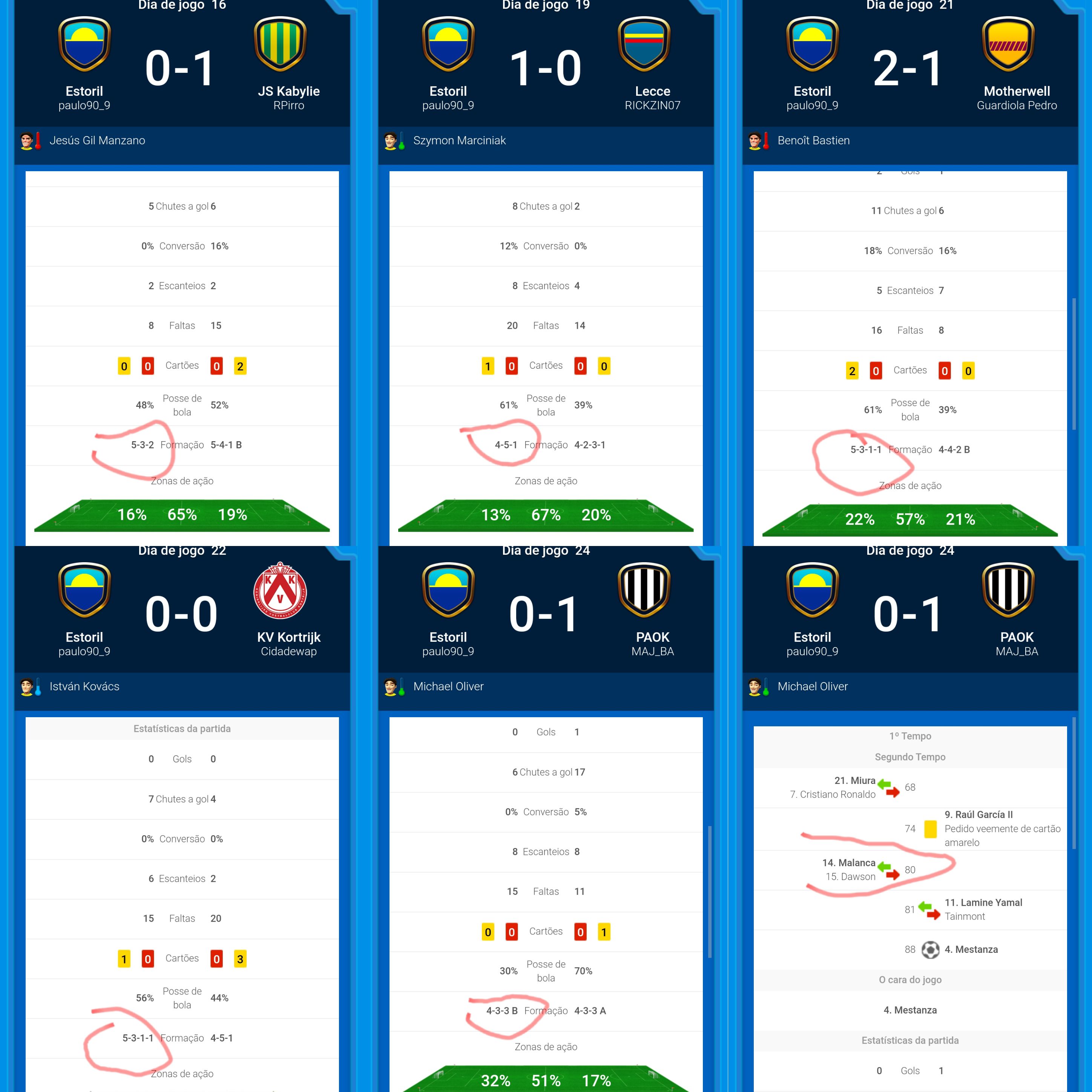 1º Antes de enfrentar o Paulo, técnico do Estoril, eu estava 12 jogos sem perder na liga, vinha de 8V consecutivas, o calendário dos meus jogos esta em anexo, para você ter acesso. Ganhei todos os jogos em casa e no confronto contra o Paulo na rodada 24, eu só precisaria de um empate, para vencer em casa na ultima rodada e garantir o titulo. Neste dia, 2 companheiros meu de equipe já tinha garantido o titulo em suas ligas, o titulo dessa estação já estava em nossas mãos e tínhamos ainda 2 finais de copa, me diga, por qual motivo colocaríamos tudo a perder por um jogo que meu elenco era muito superior, meu time estava embalado e eu só precisaria do empate?