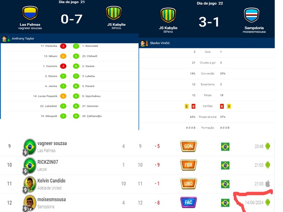 Arquivos enviados:Citação de MAJ_BA em 20 de junho de 2024, 02:36Citação de MAJ_BA em 13 de junho de 2024, 01:53Olá caros colaboradores da Sevo Sports. 3ª edição/temporadas seguida que venho aqui relatar a falta de comprometimento de alguns grupos na reta final de lnbg, ao qual os seus técnicos escala contra alguns treinadores e contra outros não. É recorrente o pessoal da UBO fazer isso e nessa edição, além de isso esta acontecendo com um técnico da minha liga, esta ocorrendo em outras ligas também com técnicos deste mesmo clã, e o técnico em questão ao qual o print comprova que ele foi para o jogo com apenas 8 jogadores, não é a 1ª vez que o mesmo faz isso na lnbg, pois já fez em outras edições. Isso é prejudicial para alguns grupos, pois tem peso na pontuação final, esses grupos devem ser penalizados ou deve ter uma reavaliação desses jogos, fica injusto com quem esta focado e comprometido e ver jogos como esse que na fase final, o SG ou apenas 1 ponto pode fazer uma diferença absurda. Esse grupo inclusive postou alinhamento atrasado, não temos nada a ver o que esta ocorrendo lá, porém é sacanagem ir titular e 100% contra alguns times e esta online e não escalar contra outros. Em outras edições ocorreu coisas semelhantes com membros do Bolados, OAP, THK, Fênix e Phoenix, decidindo titulo em reta final. Não tenho nada contra os grupos em questão e a organização não tem culpa, porém, tais atitudes recorrentes para uma 1ª divisão nacional de grupos, não deve ser tolerado. Fica aqui meu relato de indignação para falta de compromisso de tais pessoas.